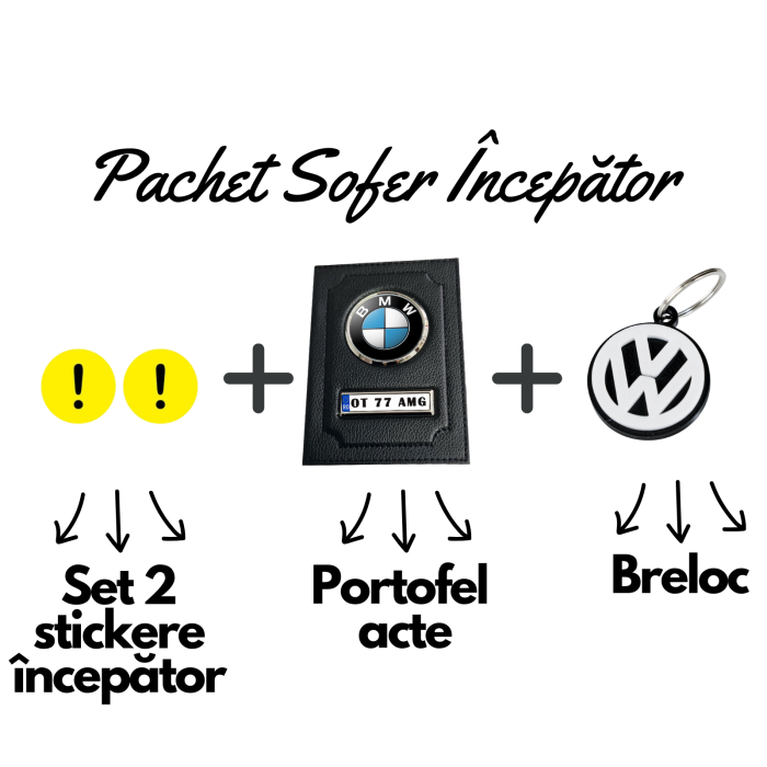 Pachet cadou premium pentru șoferi începători cu 2 stickere începător, portofel personalizat cu logo auto și număr de înmatriculare și breloc 3D cu logo mașină.
