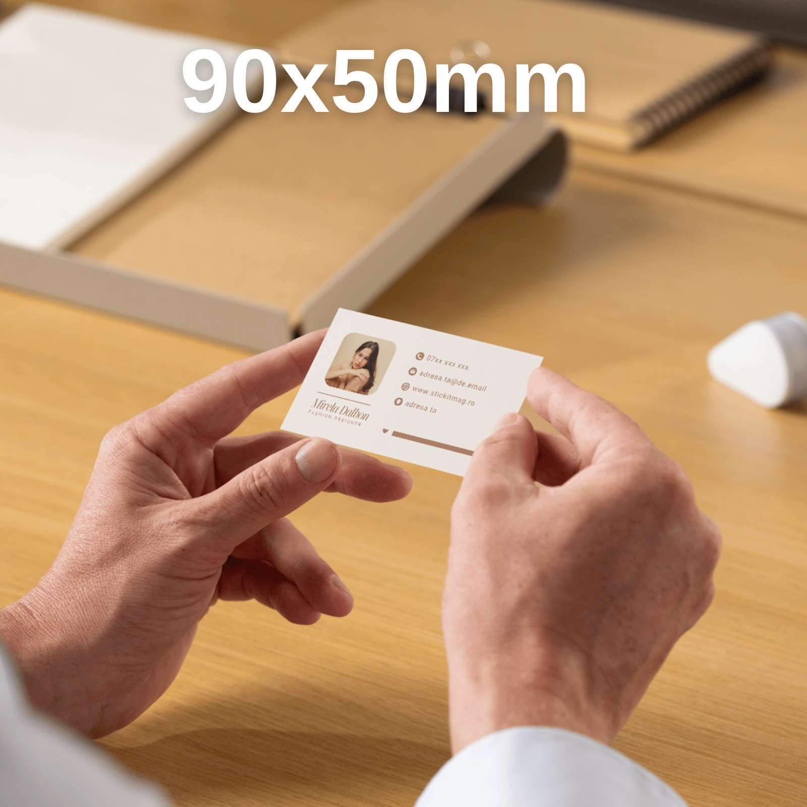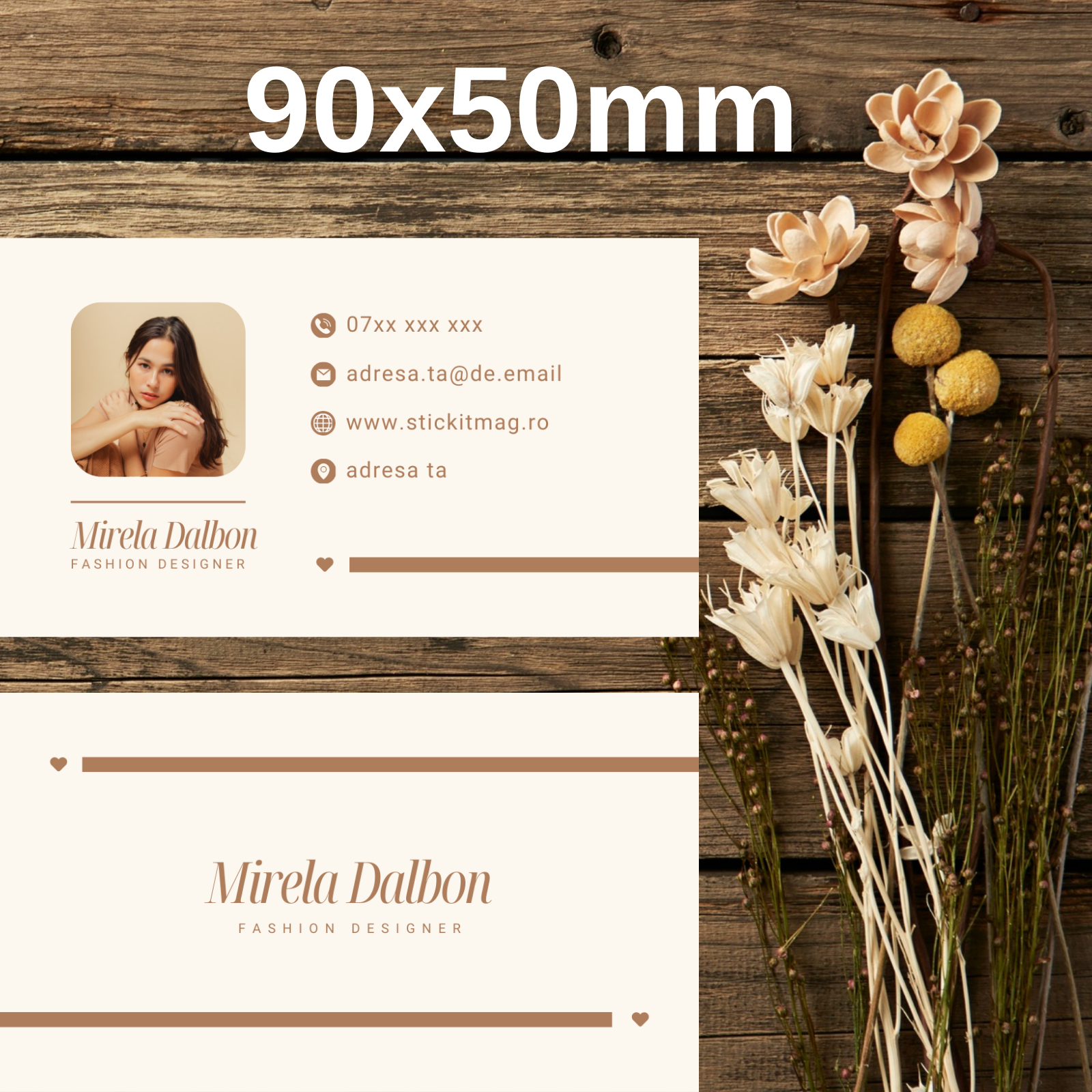 Evidențiază-ți stilul rafinat cu Cărțile de Vizită Model 16 Fashion Designer Crem & Maro, un design inspirat din tonuri naturale, calde și elegante.