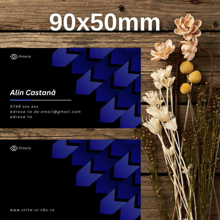Alege un design puternic și memorabil cu Cărțile de Vizită Model 7 Negru-Albastru, create pentru antreprenori și profesioniști care doresc o imagine business clară și elegantă.