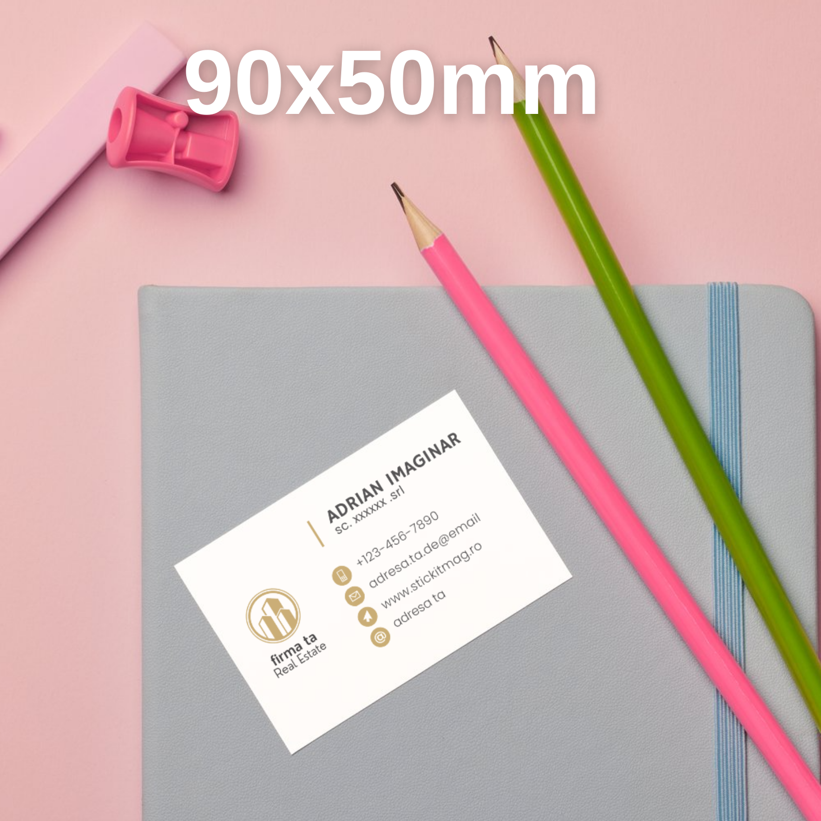 Designul este adaptat specific activității imobiliare, evidențiind datele de contact și elementele esențiale pentru clienți: rapiditate, accesibilitate și profesionalism.