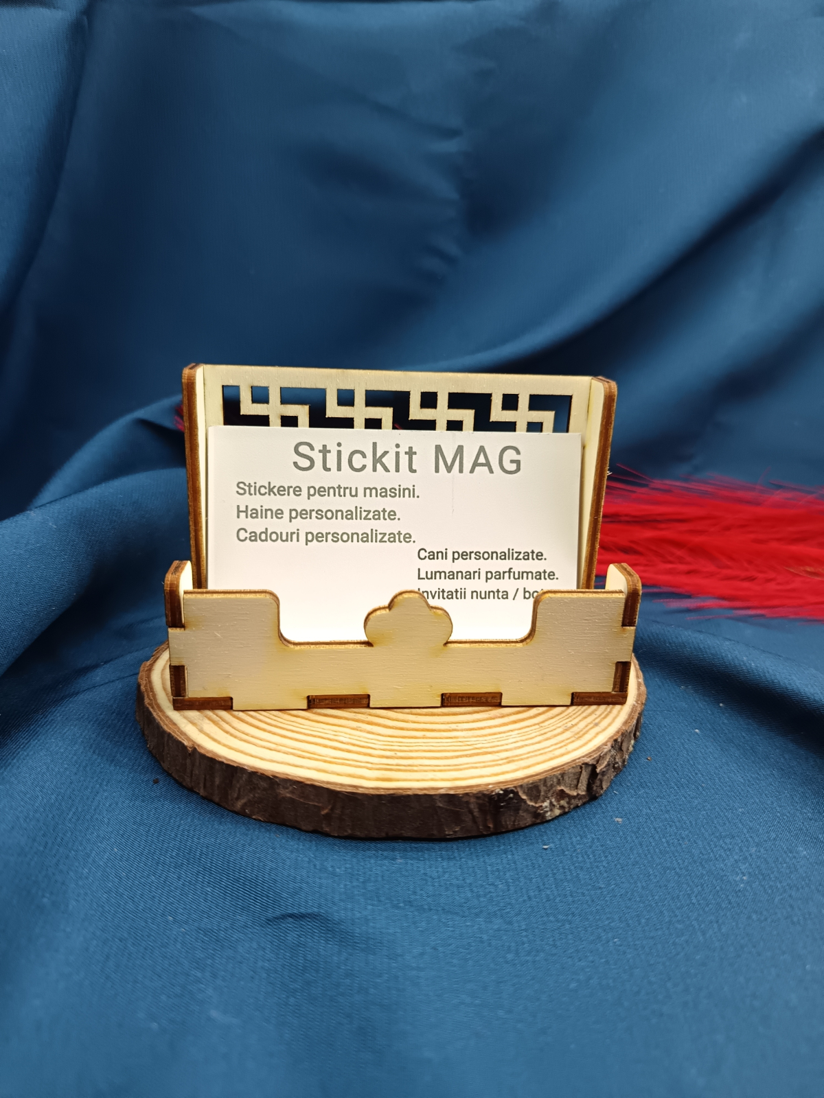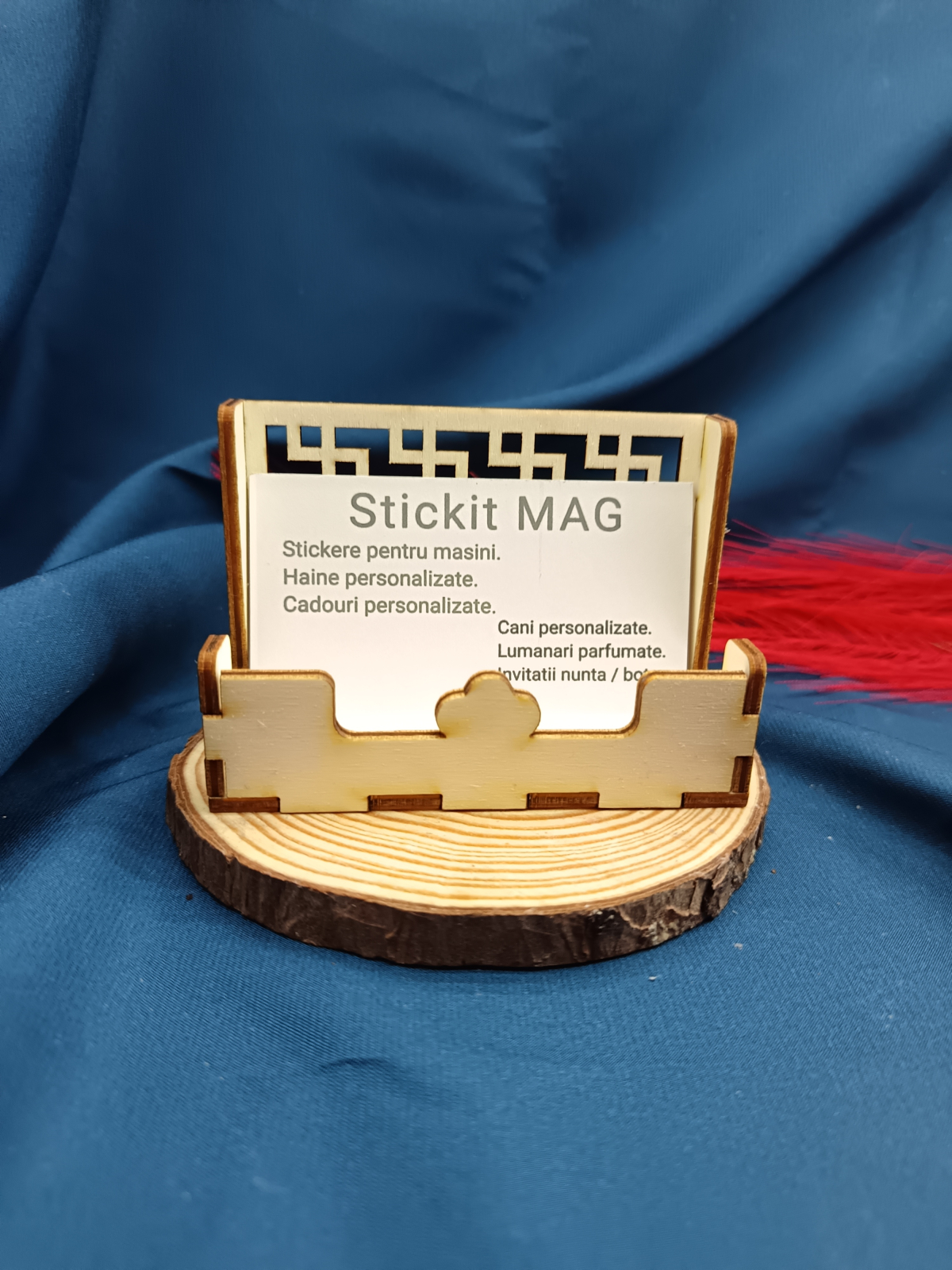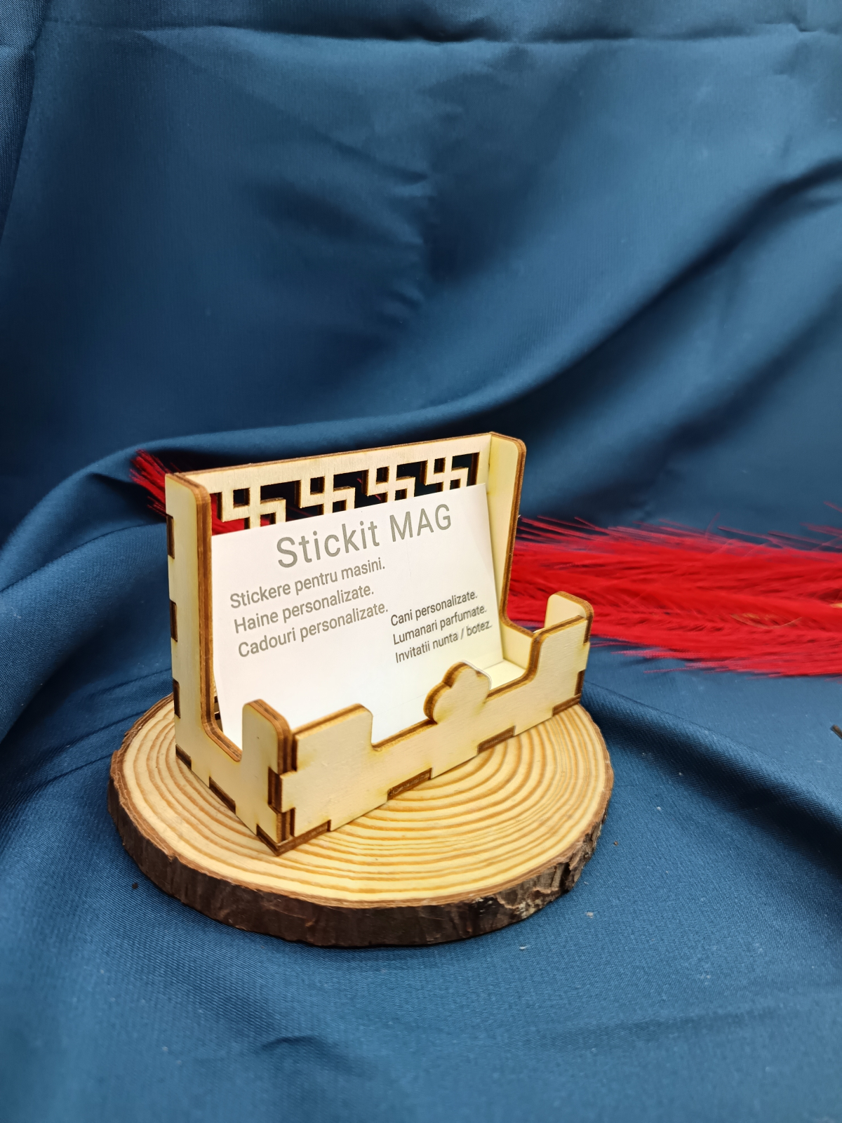 Suport modern pentru cărți de vizită din lemn de plop, cu design tip Z, realizat prin tăiere și gravare laser. Ideal pentru birouri, recepții și prezentări profesionale.