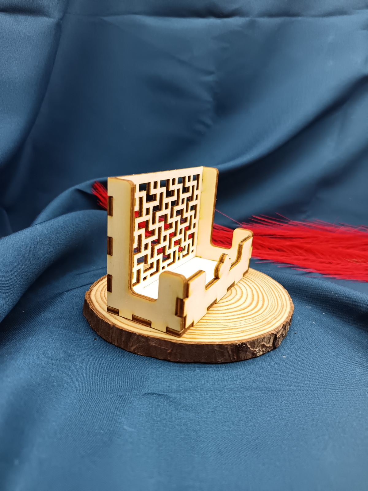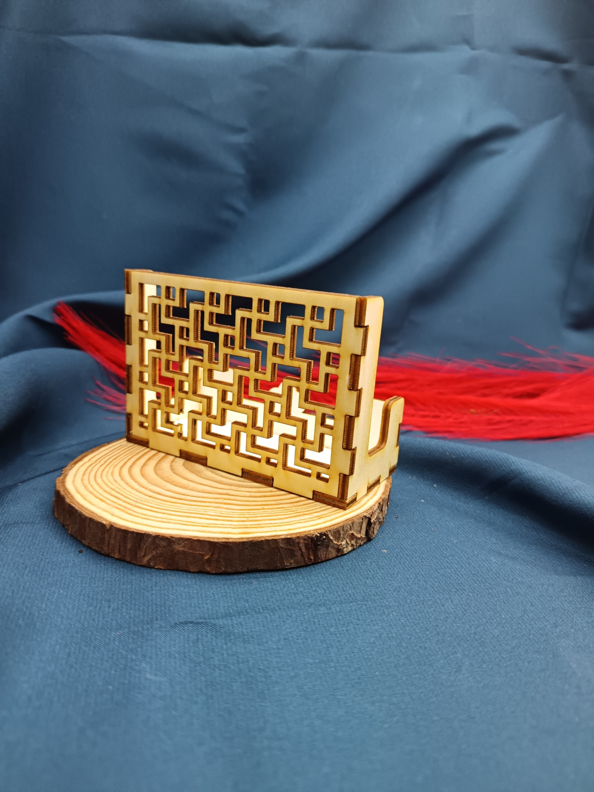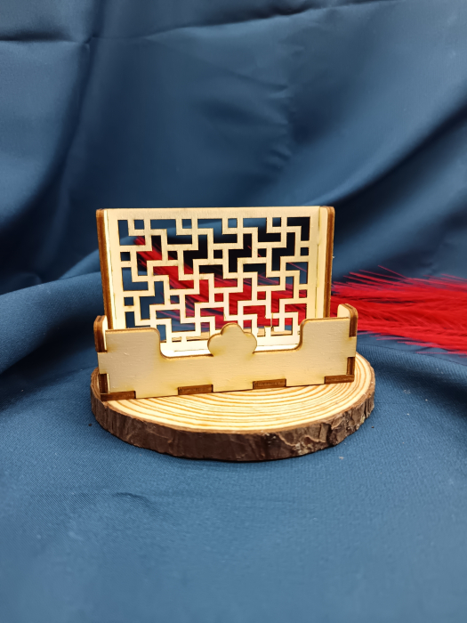 Suport modern pentru cărți de vizită din lemn de plop, cu design tip Z, realizat prin tăiere și gravare laser. Ideal pentru birouri, recepții și prezentări profesionale.
