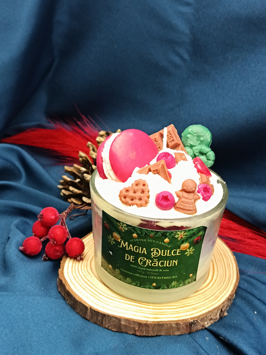 lumânări parfumate handmade, cofetăria moșului, lumânări din ceară de soia și cocos, lumânări de Crăciun, lumânări dulci, lumânări tematice, cadouri de Crăciun, lumânări artizanale, lumânări decorative iarnă, stick it mag lumânări parfumate, lumânări colecție Crăciun