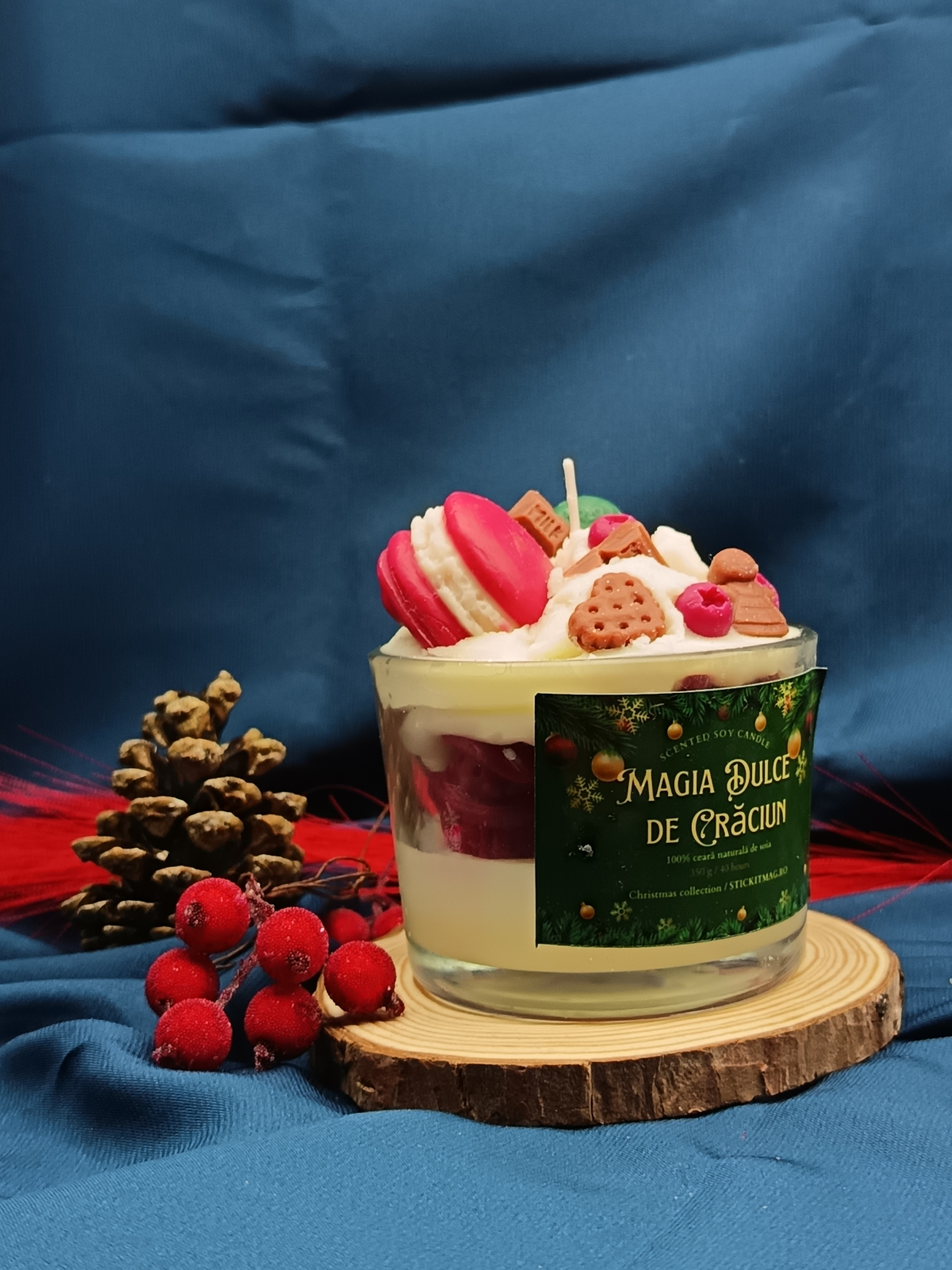 Lumânarea Parfumată Magia Dulce de Crăciun este o piesă de colecție din gama Cofetăria Moșului, realizată manual în atelierul Stick It Mag.