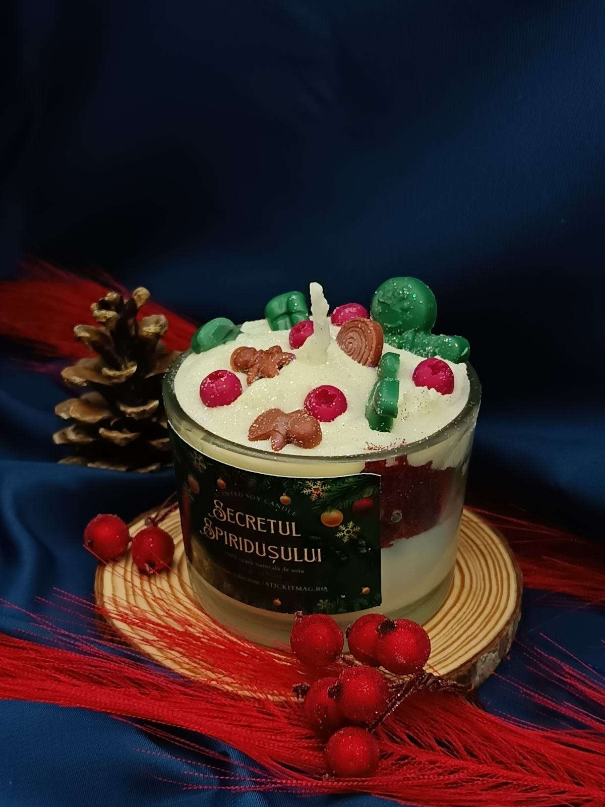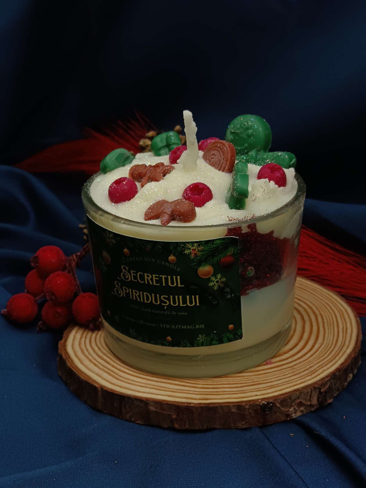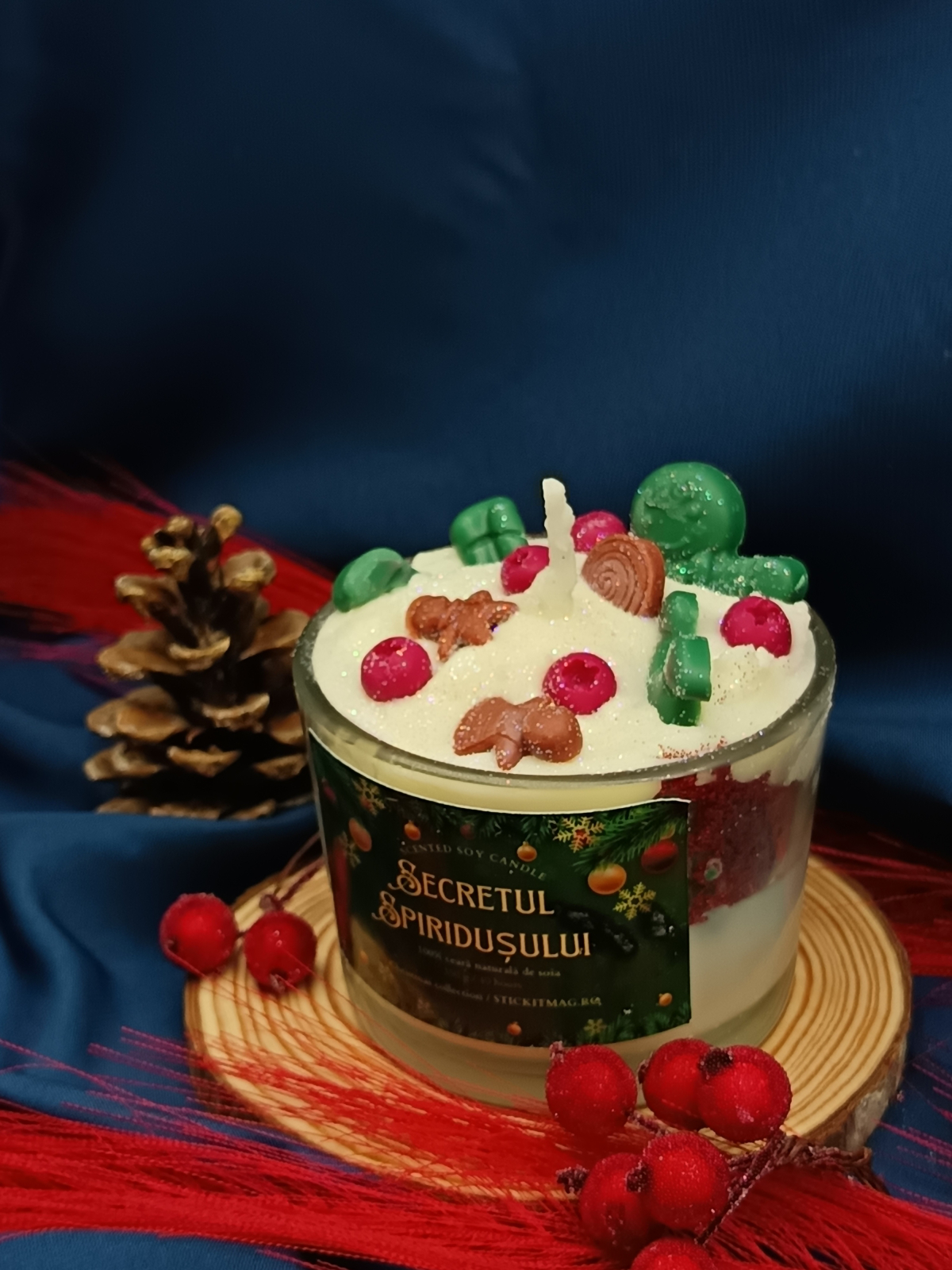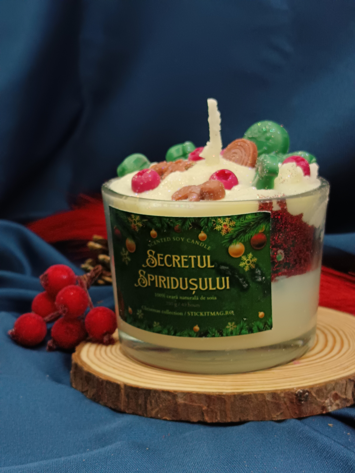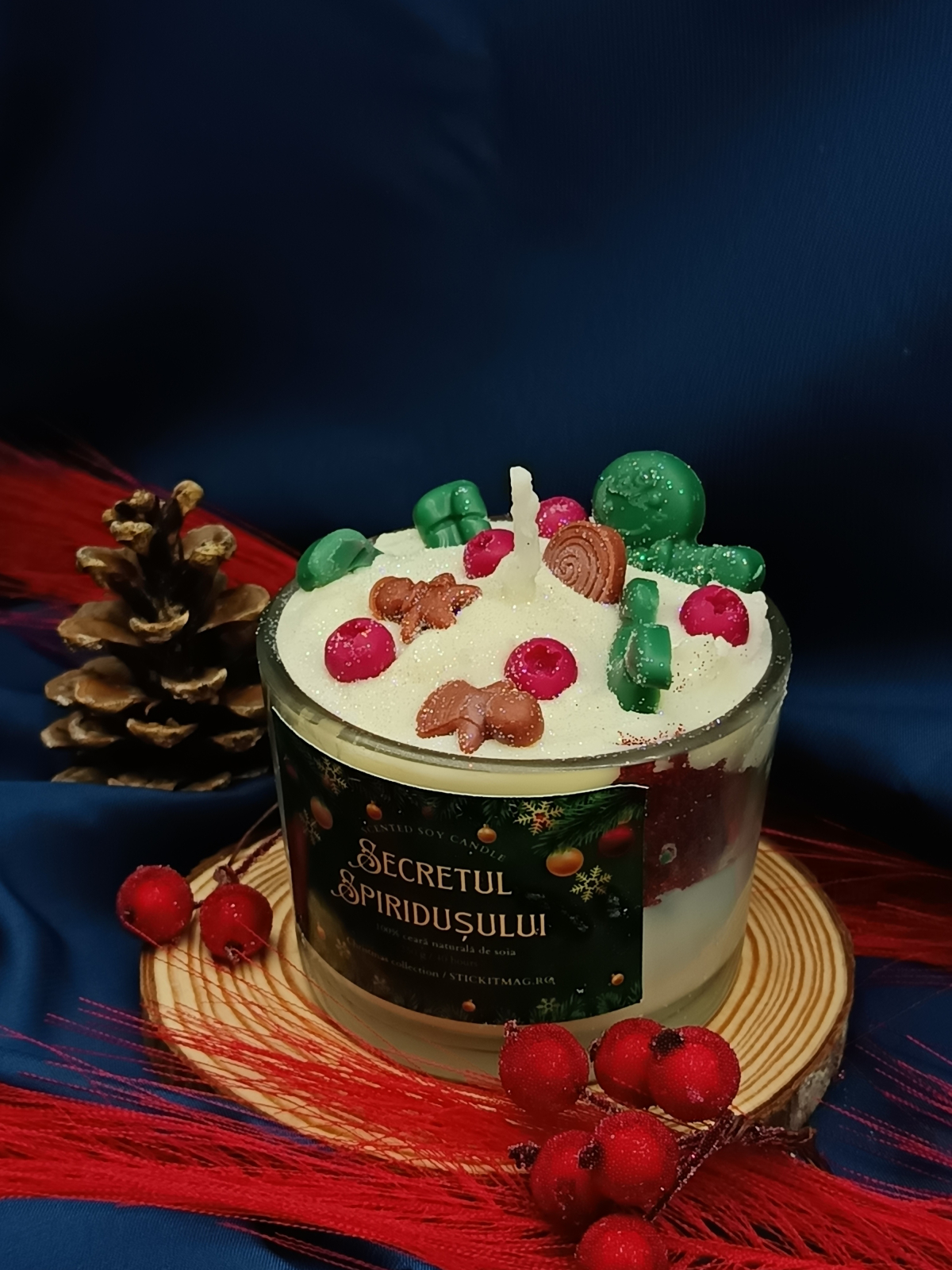 Lumânarea Parfumată Secretul Spiridușului face parte din colecția tematică Cofetăria Moșului, o gamă exclusivă de lumânări handmade realizate în atelierul Stick It Mag.