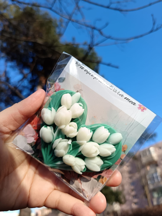 Mesajul romantic transformă această lumânare într-un cadou de primăvară cu semnificație specială.